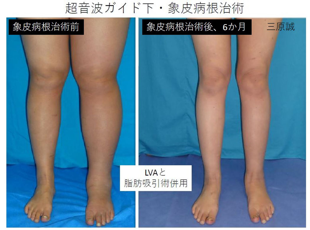 当診療チームでの象皮病根治術は、リンパ管静脈吻合術(LVA)術後に行います。LVAにてリンパの流れを改善したうえで、肥大化した脂肪組織を切除することで、術後の成績が安定します。