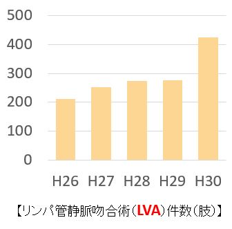 私共の診療チームでは、年間400件(肢)以上のリンパ管静脈吻合術(LVA)を実施しております/平成30年。全例において、治療効果の科学的解析を行っており、日々治療成績の向上に努めています。この豊富な治療データを基に、患者さん一人一人の治療方針を決定しています。これまでのリンパ浮腫治療は、「足を高くして寝てください」、「温泉はやめてください」、「スポーツは避けてください」という行動制限によりなされていました。